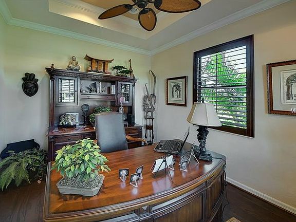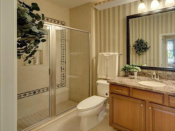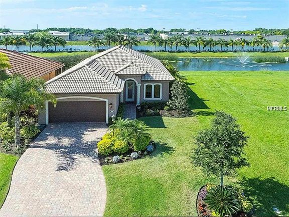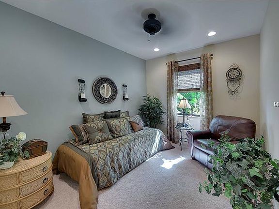 Don't build new and wait for months! Move in now on one of the BEST lots in this former model home and have ALL the great options for far less than building new! Gibralter built "Sandpiper" single family home located in maintenance free Bougainvillea Place. PROFESSIONALLY DECORATED, 3 bedrooms, 2 baths, plus den, with CUSTOM PAVER BRICK PRIVATE POOL, Large format tile, Granite throughout, Additional windows added, Upgraded kitchen cabinets featuring pull out shelves, Upgraded appliance package, 3 tray ceilings, 5 ceiling fans, wainscoting, extra lights above the kitchen island, upgraded tile in both showers, heat lamps in both baths, plantation shutters in Den, 3 ZONE upgraded A/C system, Serene LAKE VIEW. Home previously won numerous awards for floor plan, kitchen, master suite, curb appeal and was featured on the front of Homes and Land magazine! Community features include pool, clubhouse, fitness, putting green dog walking area and sitting areas.