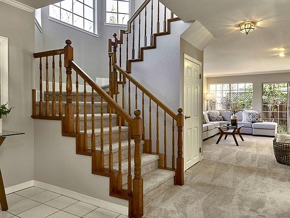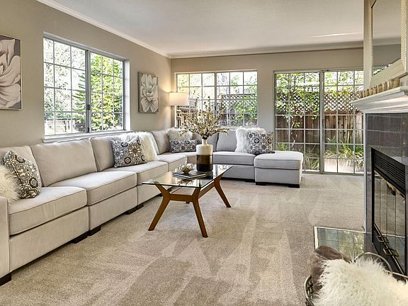 One of five homes tucked in a private enclave off McAbee between Deb Ct and Redmond. No HOA dues. Fresh interior paint and new carpeting throughout. Spacious living room has fireplace with two accent lights, plenty of windows for natural light plus a slider for access to the backyard. Dining room has crown molding, a chandelier, plenty of windows for natural light plus French doors to the backyard. Kitchen has new flooring, plenty of cabinetry plus a pantry, double sink, and a garden window. Appliances include a Magic Chef self-cleaning wall oven and microwave, dishwasher and a Whirlpool 4-burner gas cook top. Double doors open to the spacious primary bedroom suite with new carpet and corner windows that provide natural light. There is also a cozy sitting area with fireplace and two accent lights. Backyard with plenty of fruit trees, foliage, shade trees and wrap around patio.