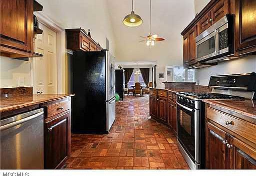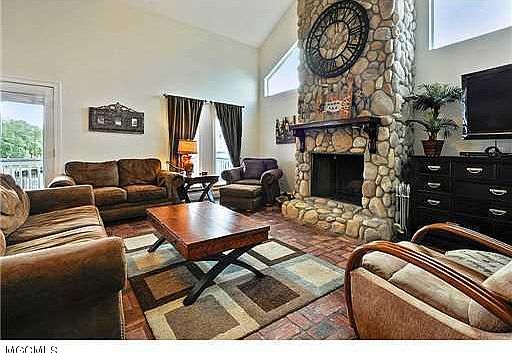 - Interior Features: Fireplace, Whirlpool Tub, French Doors, Ceiling Fan, High Ceilings, Natural Stone Counter Tops, Cathedral Ceiling