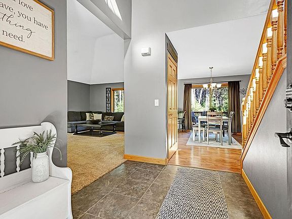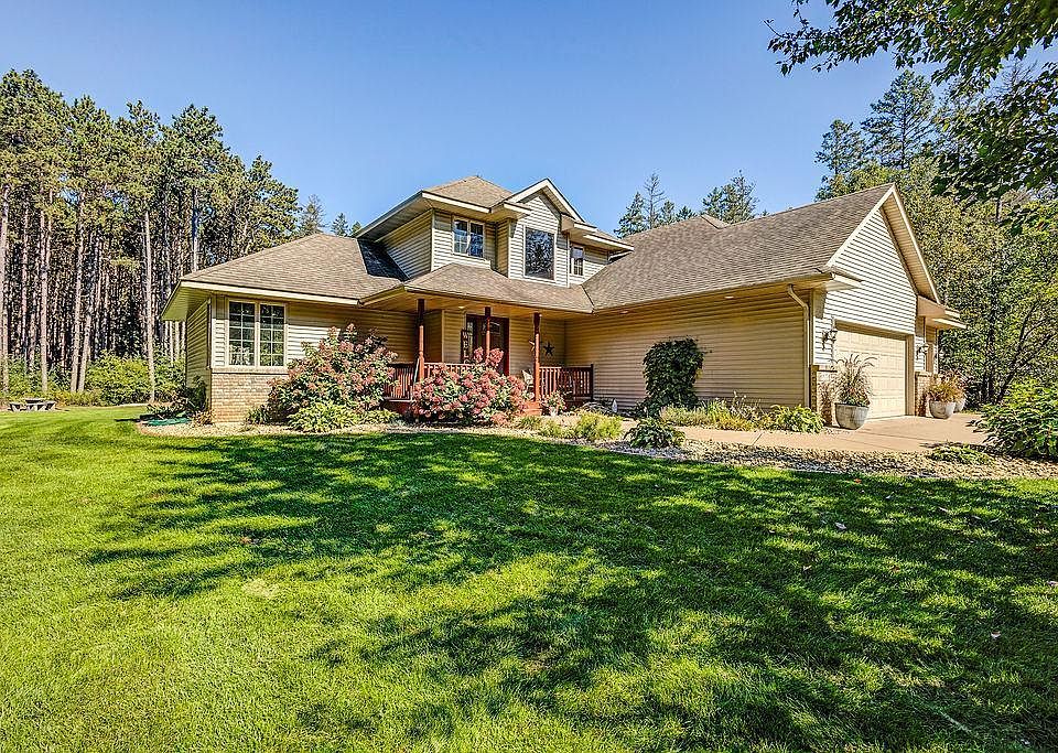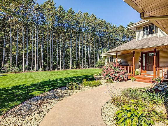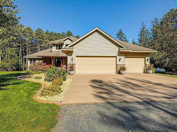 This inviting modified two-story home offers the perfect balance of privacy with the surrounding pines and convenience of location. This main-level primary suite provides easy living, while the open layout is ideal for gathering. The finished lower level features a cozy family room with warm pine-accented finishes and a built-in bar perfect for entertaining. Step outside to a spacious deck overlooking a beautifully landscaped lawn, with an in-ground sprinkler system, firepit area and plenty of room to relax and play! A spacious pole barn adds excellent storage and hobby space. All this, just minutes from I-35, offering a private retreat with quick access to town.