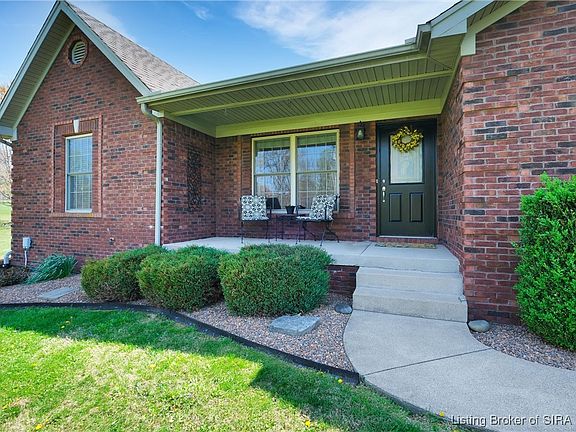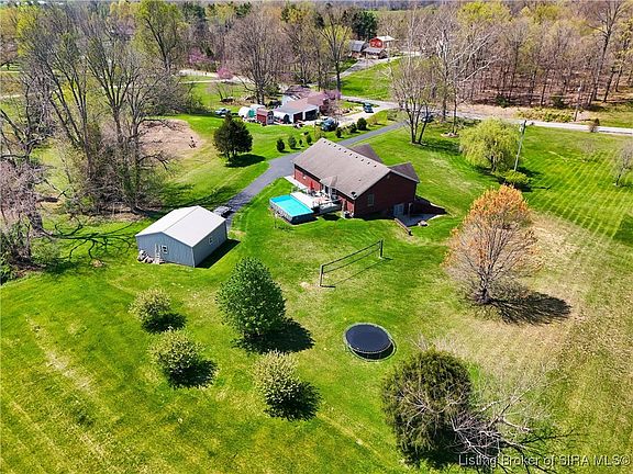 Experience the charm of this stunning split-bedroom home, featuring three bedrooms and three full baths, set on a generous 1.59-acre lot in Greenville, IN. Ideally situated just minutes from I64, it provides quick access to downtown New Albany and Louisville, while being a short walk from Greenville Park. The main level showcases a welcoming open floor plan, highlighted by a spacious living room with vaulted ceilings, an eat-in kitchen, a master suite with dual closets, two additional bedrooms, and a convenient laundry room/pantry. The finished walkout basement expands your living area with a large family room featuring a local Creekstone electric fireplace, a full bath, and a flexible bonus room that can function as an office or a fourth bedroom. Outside, relax on the deck or enjoy the above-ground pool, with plenty of parking options including a 26x20 attached garage and a 24x24 detached garage. Families will appreciate the proximity to top-rated schools such as Greenville Elementary, Highland Hills Middle, and Floyd Central High School. Greenville Park, covering 14 acres, offers two softball fields, a basketball court, a covered shelter with tables, restrooms, playground equipment, and a new .75-mile walking path for leisurely strolls.  Sellers are offering a $5000 decorating allowance.