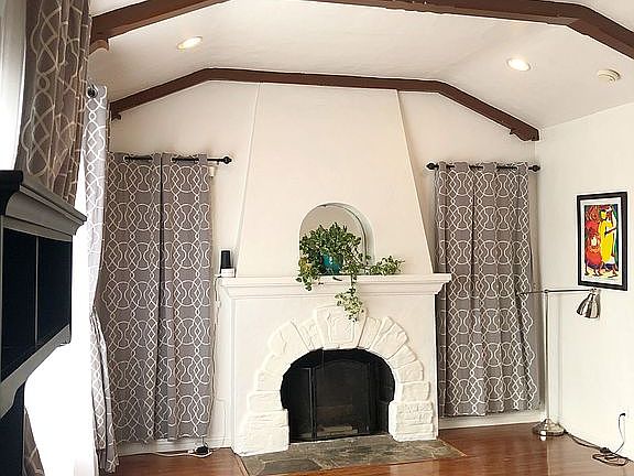 This is the home for YOU! Step through front entry gate into serenity, flowers, manicured lawn, privacy. Pass under arched front porch of this Spanish style home onto beautiful gloss wood floors of the high ceiling living room with great fire place, see decorative wood beams, perfect recess lighting. Huge family dining room adjoins upgraded galley kitchen featuring granite counters, rich cabinets, double sink, breakfast room with view, 3/4 bath and laundry. New full bath w/separate glass shower. Sizeable bedrooms. Large master bedroom double doors lead to pleasant shaded private back patio and yard. Enjoy the figs, passion fruit, grass and flowers. Home equipment includes Solar Panels (owned not leased) on roof, new 200 amp electrical panel, air conditioner is 2 yrs old, remote controlled driveway gate, rain water capture, sensor security lights, WIFI Smart Locks, remote controlled garage doors. Lots of little details make this a great home. Come see!