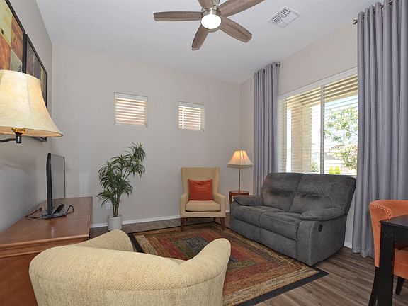 FULLY FURNISHED: Lovely 2019 Granville home, 2 bedrooms + den, 2 bathrooms, primary bedroom has brand new furniture, vinyl plank floors throughout, with 2" wood blinds, laundry room washer & dryer, 2 car garage. House has solar. Attractive landscaping front & back. Rear yard is fully enclosed with block walls, with covered patio. Landscaping maintenance provided. Weeds to be controlled by Tenant. All utilities paid for by tenant, except solar which is paid for by owner. Close to shopping and medical facilities and entertainment. Granville Amenities included with three clubhouses, Granville Rules and CCR'S apply. Pools, community rooms, fitness centers, tennis, pickleball, playgrounds, basketball court. Tenant pays a one time $25.00 administrative fee for use of these amenities. Security deposit of $2,400.00 with minimum 1 year lease. Non-smokers only. Owner pays for solar, Tenant pays all other utilities. No smokers, this is a smoke free home and no pets