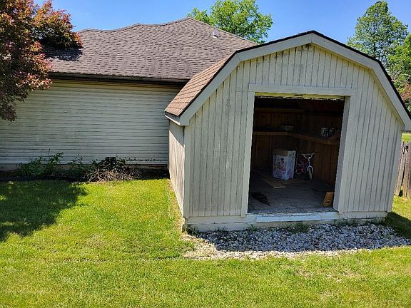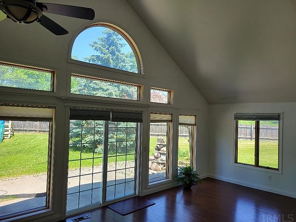 With 15 ft ceilings in main areas and 12 ft ceiling in the master bedroom, with its own patio doors, a gas wrap around the fireplace with custom wrap-around mantle. Floors are wood laminate in ALL areas except bathrooms/kitchen which are ceramic tile, no carpet. Granite counters in the updated kitchen, with all stainless steel appliances, included. Custom ceiling fans in all rooms. The Master bath has all ceramic tile including walls, with an awesome walk-in shower with granite seats and niches, along with a spa/Jacuzzi tub, and skylight. A second full bath is custom ceramic on walls and a wooden pedestal marble vanity top. Custom Closet organizers in the master and in each bedroom and hallway. Tall round top window with elaborate window-scaping. Updated interior, with doors, base, and casing, along with fluted columns. Large Fenced-in yard, with a nice view. Comes with a deluxe custom shed with shelves and a roll-up door.