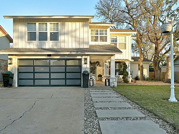 This renovated 4 bedroom/ 3 bathroom home with a pool features French inspired, contemporary finish-outs in the highly sought-after Westcreek neighborhood! The attention to detail in this home does not go unnoticed; these high-end improvements include Cambria Brittanica Quartz kitchen counters, upgraded windows, gas fireplace, a gorgeous modernized oak wood and steel railing staircase, shiplapped walls and ceilings, and white oak wood flooring throughout. Custom tile work, built-in custom cabinetry, custom interior doors, and a tasteful additional family room add a unique and contemporary feel to this exquisite home. The front yard has custom landscaping with a full irrigation system and professional lighting. Head out back to the fully turfed yard that includes a 35x15 heated pool/spa with slide, upgraded light features, and waterfall with bubble features in the layout ledge. **HUGE bonus: Katch-a-Kid pool safety system installed!** The backyard also features an outdoor kitchen area with built-in grill and an 8 foot custom cedar/boxwood fence around the backyard to allow for increased privacy. The stand-alone, 200 sq ft flex space has additional sound-proofing, making it great for a private office or music studio. The attached two car garage has epoxied floors, a mini-split heating/cooling system, and custom cabinetry. The South Austin neighborhood of Westcreek features a greenway and park with hiking trails to explore nature!