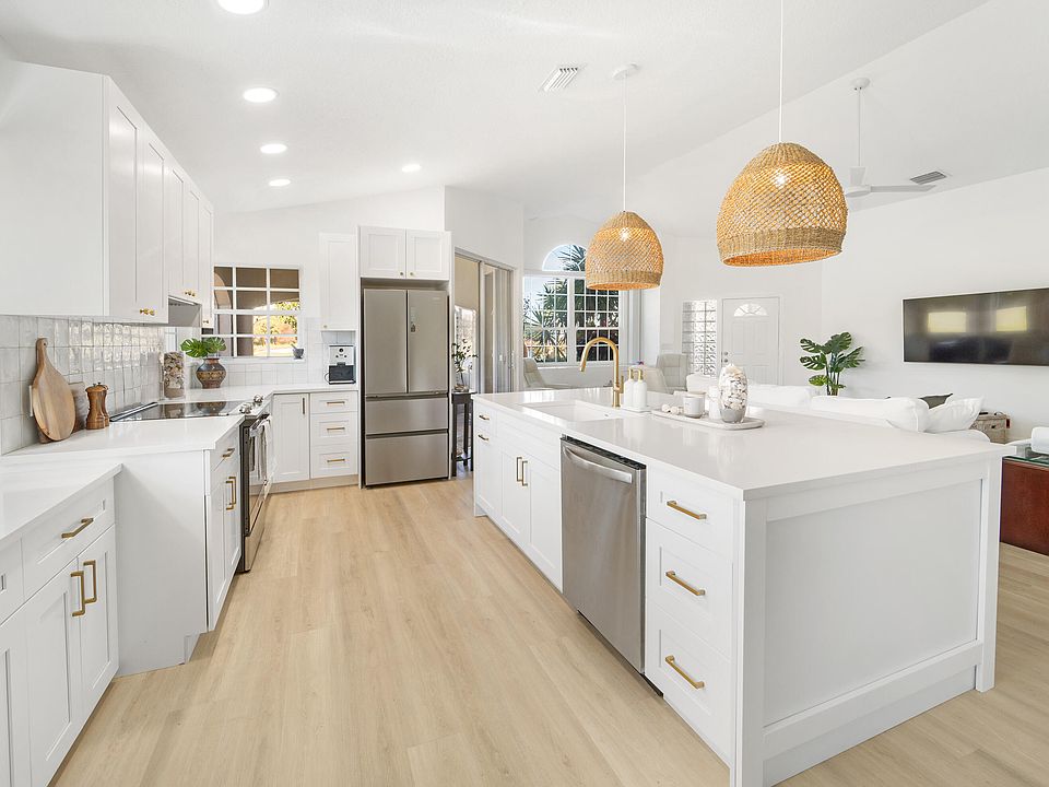 Completely renovated bathroomInviting open-concept floor planStylish new kitchen flooring