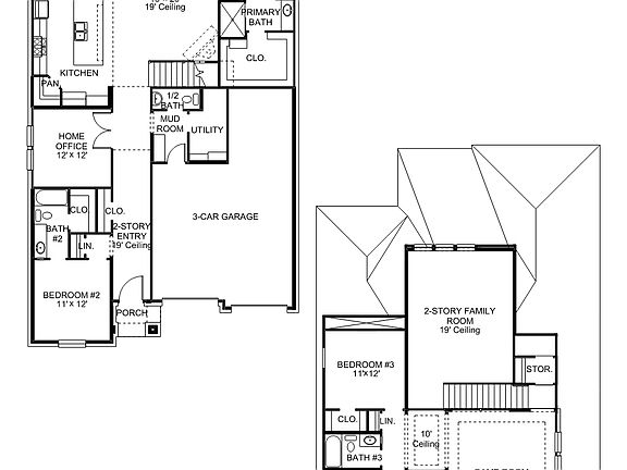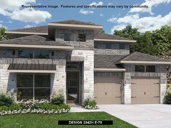 Home office with French doors set along one side of two-story entry. Kitchen and dining area open to two-story family room. Kitchen features corner walk-in pantry and generous island with built-in seating space. Two-story family room features wall of windows. First-floor primary suite includes bedroom with 10-foot ceiling. Double doors lead to primary bath with dual vanities, garden tub, separate glass-enclosed shower and large walk-in closet. First-floor guest suite offers private bath. Game room and two secondary bedrooms are upstairs. Covered backyard patio. Mud room off three-car garage.