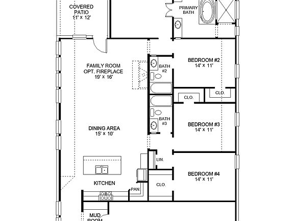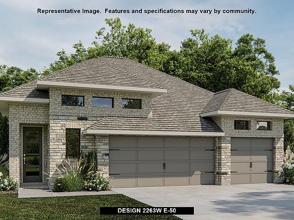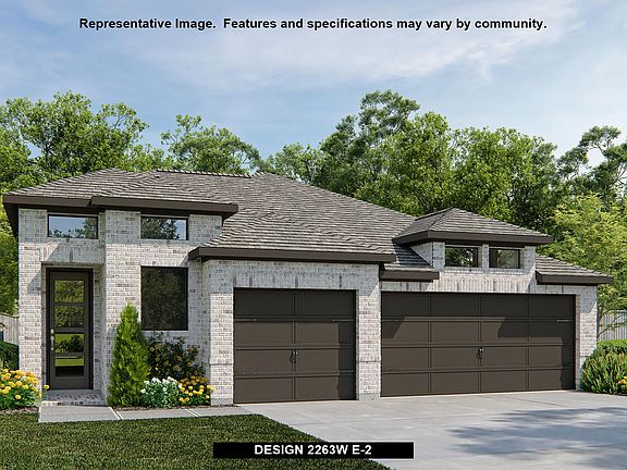 Welcoming front porch opens to entry framed by a wall of windows. Open family room with a wall of windows and fireplace. Kitchen features an island with built-in seating space and a corner walk-in pantry. Dining area just off kitchen flows into the family room. Primary suite with three large windows. Primary bath features a French door entry, dual vanities, garden tub, separate glass enclosed shower and two walk-in closets. Secondary bedrooms with walk-in closets and a guest suite with a full bathroom complete this design. Covered backyard patio. Mud room and utility room just off the three-car garage.