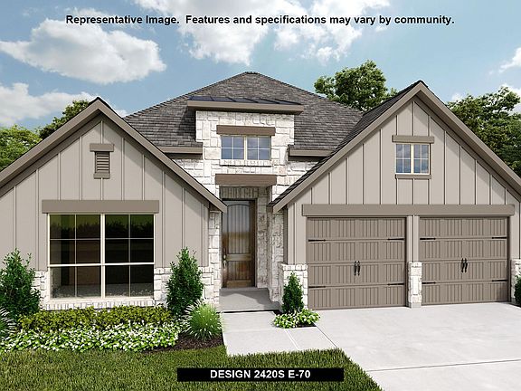 Entry welcomes with 12-foot ceiling. Home office with French doors off extended entry. Spacious family room with wall of windows opens to kitchen and morning area. Kitchen offers walk-in pantry and generous island with built-in seating space. Private primary suite. Dual vanities, corner garden tub, separate glass-enclosed shower and large walk-in closet in primary bath. Secondary bedrooms plus a guest suite complete this open one-story design. Covered backyard patio. Mud room off three-car garage.