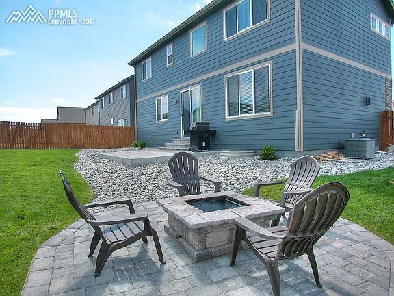 You won't be disappointed in this exceptional 2-story home with lots of upgrades located on a large beautifully landscaped corner lot. Very open & bright floor plan with great room concept. 4 Bedrooms all on one level & laundry is a plus! This Sundance model features hardwood floors from entry through to the kitchen, high ceilings, granite counters with back-splash, island, upgraded appliances walk in pantry, gas fireplace in great room, A/C. Enjoy entertaining in the spacious back yard with extended patio & fire pit Upstairs the master bedroom is adjoined by a large 5 piece bath & walk-in closet. There are 3 additional bedrooms, a good sized laundry room and a full hall bath with double vanities. The large unfinished basement provides you with lots of extra storage or finished at a later date. The 2 car tandem garage makes it a 3 car garage gives you added storage & room for toys or shop. Perfect location with proximity to Ft. Carson, Peterson AFB, Shriever AFB and the Powers Corridor which provides shopping restaurants and so much more.