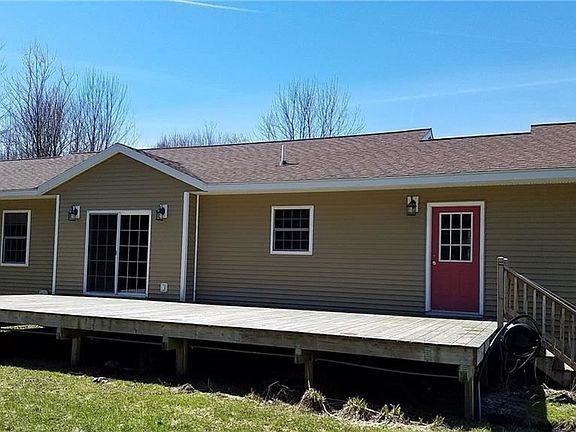 Great 10 year old ranch on over 3 acres. Home features 3 bedrooms and 2 full baths. Fully applianced kitchen with breakfast bar and dining area. Large living room. Nice master bedroom and bath with 3 closets. Full basement has partially finished family room and office. Still not everything complete but ready for you to finish. Home sits back off road and has a rear deck. Big 2 stall garage does have a handicap ramp and leads into a large mud room. First floor laundry. Above ground pool. Country home with city water and Natural gas heat.