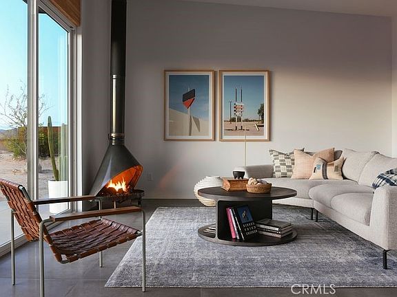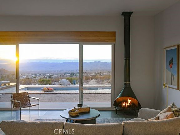 Welcome to Hightail House, a luxurious and special property, where mid century modern meets Scandinavian chic. Situated on over two acres, this retreat has commanding views of Joshua Tree National Park from every glass-walled room inside the home and from every intended place on the grounds. The great room is where we want to gather and enjoy the beautiful view and the warmth of the vintage Malm gas fireplace. The kitchen has gorgeous designer tiled walls, a welcoming center island, quartz countertops, stainless steel appliances and wine refrigerator. Both of the stunning bedroom suites have luxurious bathrooms, direct to the outdoors access and unobstructed views of the Joshua Tree mountains. Outside is a custom oasis featuring an in-ground heated swimming pool with tanning shelf, an umbrella and spa surrounded by exotic Ipe wood decks. Metal privacy fencing gives a feeling of intimacy for the large piece of land. There is a bocce ball court, propane fire pit, an outdoor shower and a covered living/dining area with custom furniture and built-in barbecue grill. There is also an electric vehicle charging station. This home is artfully curated with a keen eye for high style in both indoor and outdoor living. This impeccably maintained designer vacation rental home is being sold turn-key.