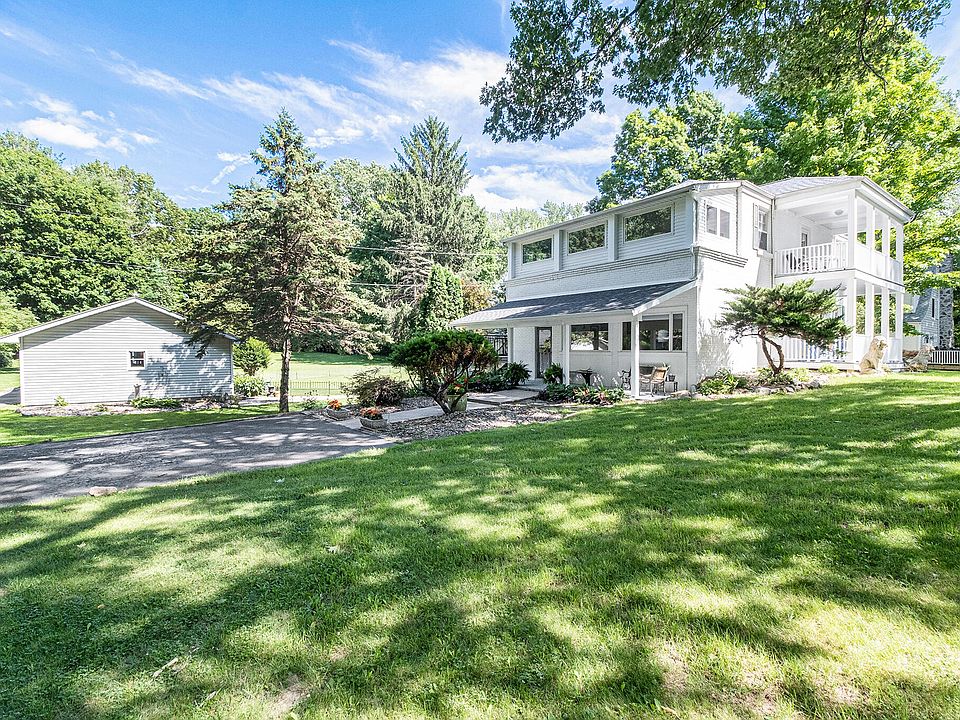 Bair Lake home with sandy beach frontage is just the beginning of this fabulous 2 story home. You'll appreciate the timeless architecture and all it's amazing woodwork and original flooring throughout this home. Upon entering the home you will love the sprawling white new kitchen with it's granite countertops. The views from the breakfast area into the wooded and sprawling rear yard is a must see. The kitchen comes complete with appliances. Upon entering the dining room you will appreciate the natural light, timeless wood doors and woodwork. The living room overlooks Bair Lake and has amazing plaster work and a gas log fireplace, The family room is great for fall entertaining for the upcoming holidays. The upstairs features 3 generous size bedrooms with an abundance of storage space. A full bath with with separate walk in ceramic tiled shower and a separate whirlpool tub are invitations to relax and unwind. The porch just off the 2nd floor bedroom would be charming for a sleeping porch, art studio or office area. There is also a new 2 story front porch that can easily be accessed by the front door and just off the 2nd floor landing by the staircase. The basement has plenty of storage space and has a sauna! The detached 2 car garage has plenty of space for vehicles and the barn gives you additional space for all your hobbies. You'll appreciate the almost 2 acres of gardens, fruit trees and wildlife. Cross over M-40 to the 185' ft of Bair Lake frontage with it's tranquil view and sandy beach that you will enjoy for years to come. Dock is included in sale. This home is a rare find and has been lovingly well kept. All measurements and descriptions believed to be accurate but buyer should verify.