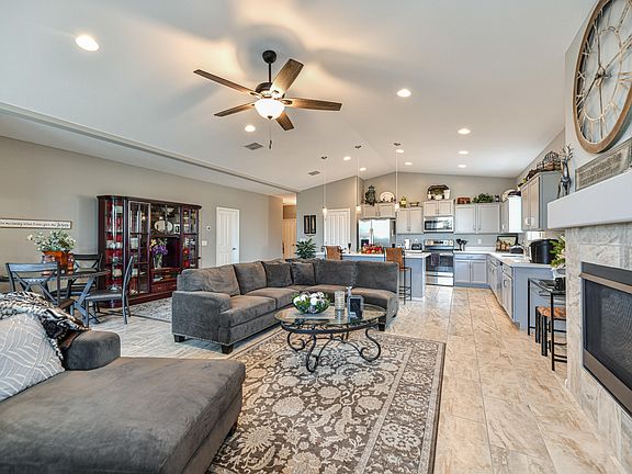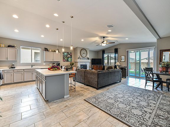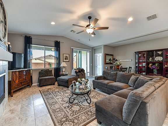 No build time needed, move in ready with many upgrades. 3rd bedroom, gas fireplace, kitchen island, stainless steel appliances, tile flooring in main living area with carpet in the bedrooms, quartz counter tops in the kitchen, gray painted cabinets, custom security screen on the front door, ceiling fans in all rooms, window coverings through out, storage racks on garage ceiling for extra storage. Front and back landscaping professionally finished with extended paver patio and artificial turf in the back yard. Must see..........Great starter home or perfect for downsizers, single level. Listing agent is related to owners.Professional pictures to follow asap