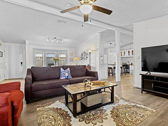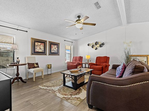 This fully furnished, beautifully remodeled home is a decorator's dream! Offering 1,664 sq. ft. of stylish living space, it features a split floorplan with 2 bedrooms, a den, and 2 bathrooms. The kitchen boasts quartz countertops, white cabinetry, a built-in desk, a walk-in pantry, and a spacious island. The den is enhanced with charming shiplap accent walls. Durable laminate flooring runs throughout the main living areas, with tile in the bathrooms. The primary suite includes a walk-in closet and a stunning barn door leading to the ensuite bath, which offers a step-in shower, dual sinks, and a separate soaking tub. The guest bath is equally well-appointed with a step-in seated shower. Outside, you'll find a convenient storage shed and a designated golf cart pad. Experience Thesman Communities Lifestyle, we are an active 55 plus community where luxury meets affordability. For over 40 years we have set the standard with world class amenities and year-round activities. Our community is a 24-hour gated community, with a beautiful 12,000 square foot clubhouse including ballroom, fireside lounge, library with computers and individual rooms for cards, billiards, arts & crafts and fitness center. Enjoy outdoor amenities heated pool & spa with cabanas, BBQ area, pet park, sport courts for pickleball, horseshoes and shuffleboard. Our activities director assures a full calendar of social and recreation events. Our shuttle bus makes it easy and convenient to attend sporting and special events, plus local shopping. Whether you want to relax or stay active our vibrant communities offer everything you need to enjoy life to the fullest. Discover Thesman Communities and start living the Thesman Lifestyle today!