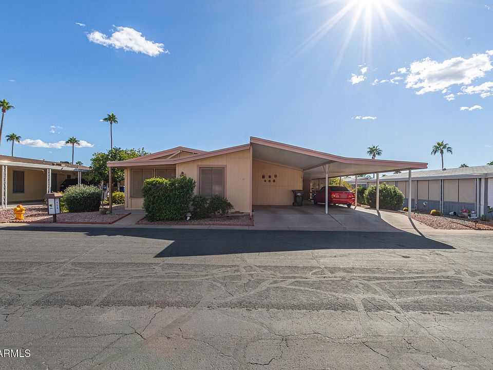 Welcome to Palmas del Sol! This charming 2-bedroom manufactured home features an attached carport and a welcoming patio. Inside, you'll find an inviting living room with vaulted ceilings, exposed beams, wood-panel walls, and soft carpeting. The kitchen comes with granite counters, wood cabinetry with crown moulding, built-in appliances, and a peninsula with a breakfast bar. The cozy main bedroom offers a walk-in closet and an ensuite with double sinks. Venture out onto the backyard, complete with a covered patio and a storage shed. Make it yours!