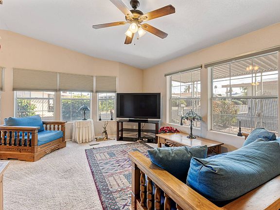 This beautifully maintained 3-bedroom, 2-bath home offers 1,456 sq. ft. of living space plus a spacious screened Arizona room for year-round enjoyment. The upgraded kitchen features maple cabinetry, granite countertops, a kitchen island, and walk-in pantry. Enjoy laminate flooring, dual-pane windows with sun screens, security doors, and a laundry room with washer and dryer. The master suite includes a large walk-in closet, access to the screened room, and an en-suite bath with dual sinks and a step-in shower, while the guest bath offers a tub/shower combo. Ceiling fans are found throughout, and the home also includes a large back patio golf cart pad and a storage shed with workbench. Experience Thesman Communities Lifestyle, we are an active 55 plus community where luxury meets affordability. For over 40 years we have set the standard with world class amenities and year-round activities. Our community is a 24-hour gated community, with a beautiful 12,000 square foot clubhouse including ballroom, fireside lounge, library with computers and individual rooms for cards, billiards, arts & crafts and fitness center. Enjoy outdoor amenities heated pool & spa with cabanas, BBQ area, pet park, sport courts for pickleball, horseshoes and shuffleboard. Our activities director assures a full calendar of social and recreation events. Our shuttle bus makes it easy and convenient to attend sporting and special events, plus local shopping. Whether you want to relax or stay active our vibrant communities offer everything you need to enjoy life to the fullest. Discover Thesman Communities and start living the Thesman Lifestyle today!