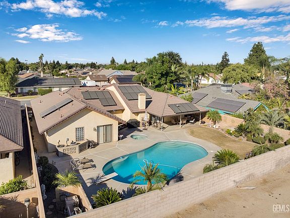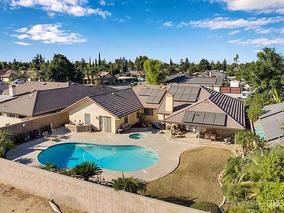 Clean Olive Drive area pool/spa home. Tile roof, 2,625sf 3 bed, 2 bath, 2 living areas + office on a 10,018sf lot includes an entertaining backyard with a covered patio and a large swimming pool and heated inground spa. Kitchen includes Oak cabinets, Black appliances including a double oven, range, microwave, dishwasher, trash compactor and tile counters. Family Room include a brick gas fireplace, vaulted ceilings with wood beam and wood framed French doors leading to the backyard. Home also include a large formal living room, formal dining area and addition dining area off the kitchen. Master bedroom includes a retreat area, vaulted ceilings and access to the back yard. Master bath has upgraded jetted tub plus a separate shower, double vanity sinks and a large walk in closet. Other upgrades include oak cabinets in the hall and laundry area plus oak doors throughout. 8.8KW solar system lease comes with a locked in low monthly payment for entire term.