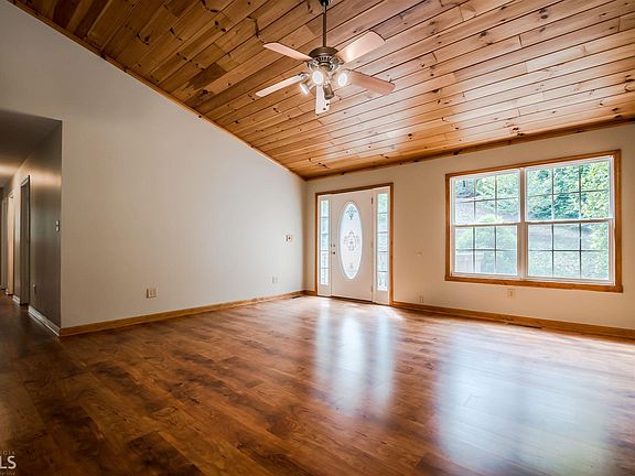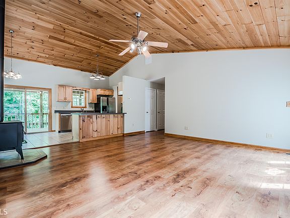 UNPARALLELED PRIVACY! This newly renovated home on 5.62 acres is waiting for you! New, easy care, laminate flooring, fresh paint throughout, new ventilation system enabling wood stove to heat the entire house resulting in lower heating bills, quiet, yet only 10 minutes from the heart of Toccoa and only five minutes from the public boat ramp at Lake Hartwell. Extremely large master with ensuite, open floor plan. Kitchen and dining open to a large living room with vaulted tongue and groove ceiling and wood burning stove. Deck wraps around the side of the house and a covered back porch with tongue and groove ceiling await your summer cookouts. Drive under garage with unfinished basement.