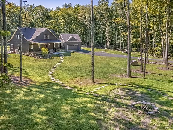 Tucked away in a peaceful country setting yet just minutes from some of the Hudson Valley's most beloved destinations, this thoughtfully designed home offers the perfect balance of luxury, comfort, and sustainability. A light-filled open floor plan showcases soaring ceilings and a beautiful stone fireplace that anchors the living space. Walls of windows bring the outdoors in, seamlessly connecting the interior with its natural surroundings. An elegant chef's kitchen featuring custom cabinetry, high-end appliances, a generous center island, and a wine bar—is ideal for both everyday living and entertaining. First-floor primary bedroom, complete with an en-suite bath, walk-in closet, and private porch access. Upstairs, two additional bedrooms, a full bath, and family room provide inviting accommodations for guests or quiet relaxation. Practical details, such as a breezeway-connected two-car garage and mudroom, adds both convenience and charm. A full basement offers a wine cellar and walk-out access, while a whole-house generator provides peace of mind year-round. A state-of-the-art geothermal system enhances the home's energy efficiency, underscoring its modern sustainability. The property is securely gated and enclosed by surround fencing, creating a private haven of peace and tranquility. Designed for both leisure and adventure, the landscape invites you to gather around the firepit and enjoy the ridge views or explore the wooded trails. Expansive patios and decks create the perfect backdrop for al fresco dining and entertaining. Completed just last year and enhanced with premium upgrades, this residence is truly turnkey and one of a kind. With proximity to Minnewaska State Park, Mohonk Preserve, Tillson Lake, Wildflower Farms and countless farm-to-table experiences, the best of Hudson Valley living is at your doorstep.