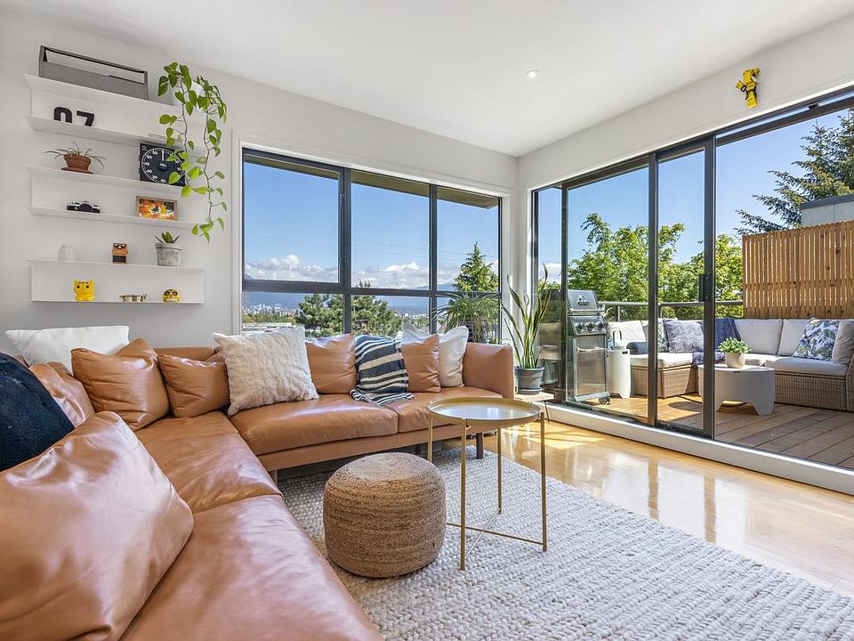 On the top floor of one of Mt Pleasant's most sought after buildings, this airy penthouse shines with a generous layout, tasteful renovations & sweeping views of the mountains/city throughout. The open plan is spacious & bright with corner exposure to mature trees & ultimate privacy. The lovely modern kitchen boasts s/s appliances, tile backsplash, pantry & prep island. The living/dining areas, with access to a large, private view deck oasis, are great for entertaining. Spa-like bath, wood floors, great closets, laundry, bike storage, locker & parking included. Fabulous rainscreened strata is fully upgraded & worry-free! Nestled on a quiet block, a short stroll to shopping, parks, the upcoming St Paul's hospital & Broadway train line + so much to do in the Main & Fraser St corridors. COOL!