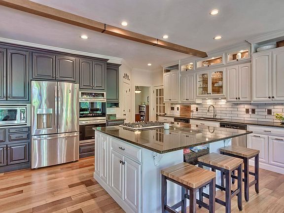 Executive Custom home on 126 ft of Lake Frontage! This 5 bedroom home has it all inside and out! Enjoy the many outdoor living features: Built in Grill, basketball Ct, fire pit, extensive Patio, waterfall, corn hole pit, private dock, Beautiful view and landscaping. Room to add a pool or playground! This is one of the best lots on the Lake! Inside you will fine beautiful hardwood floors, custom kitchen with keeping room, two dishwashers, double ovens, gas island cooktop, under counter lighting, custom cabinets, built in breakfast nook, Office or formal dining room/living room, Master bedroom with custom walk-in closet,
