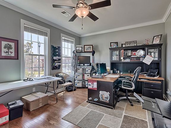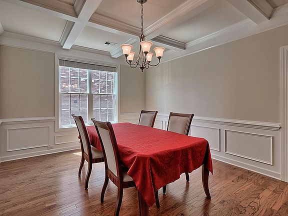 Your new home awaits on a quiet lot in the highly desirable Caedmons Creek subdivision. The manicured lawn and beautiful brick exterior are just the beginning. The backyard offers ample privacy and a wooded view that is rare to find in newer built homes. The entry greets you with a two-story foyer, hardwood floors, and a flex room perfect for a home office. Walk through the formal dining room with coffered ceilings and into the impressive kitchen that features a pantry, granite countertops, speakers, recessed lighting, an oversized island, butlers pantry, and more; an ideal space for hosting! The kitchens open concept faces the eat-in breakfast area and living room where you will find a cozy fireplace and french doors leading outside to the covered patio with custom stone flooring. The main level also contains a bedroom, full bathroom and office space that could be transformed into a mudroom. The owners suite can be found upstairs and it is fit for royalty! It has a cozy fireplace, sitting room and french doors that open into a tiled ensuite bathroom. Imagine yourself soaking in the garden tub and getting ready for your day in the expansive closet. Down the hallway are three additional bedrooms, the laundry room, two full bathrooms, and a bonus room. Your storage needs will be met with large closets and flooring in the attic. The neighborhood offers a community pool, playground, and sidewalks throughout the neighborhood. Don't miss your opportunity make this home YOURS!