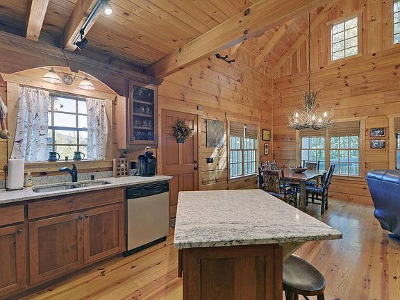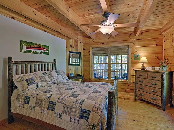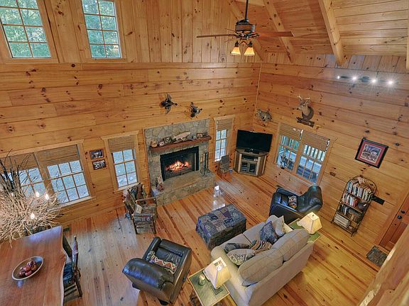 Custom cabin in the big woods adjacent to the Chattahoochee National Forest with ultimate privacy! This custom, true log cabin is nestled on 6.5 gorgeous acres adjoining the National Forest and Coopers Creek Wildlife Management Area. Ultimate end of the road privacy with stunning mountain views. Large front porch welcomes you into this mostly furnished well-built home. You will know you have found paradise when you see the wood burning stone fireplace in the bright and cheerful living area with soaring cathedral wood ceilings with exposed pine beams and windows. Beautiful, pine floors throughout home, granite counters, stainless appliances. Master bedroom on main, upstairs bedroom +loft and an additional bird's nest loft. Dining room door opens onto spacious deck with pergola which steps down onto a flagstone area with a wood burning stone outdoor fireplace to enjoy the best views and cool mountain air. Detached, one car garage for all of your mountain toys. These 6.5 acres include 3 additional building lots with electric/telephone/water available. Only minutes to public fishing waters of Coopers Creek and Toccoa River and miles of pristine hiking trails. A scenic drive into the nearby towns of Blue Ridge and Blairsville for dining and shopping. One of a kind!
