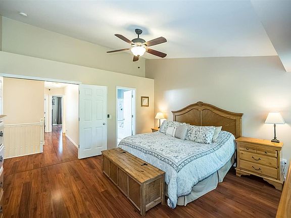 Open Floor Plan: Highlighted by vaulted ceilings, wood floors, and a wood-burning fireplace.