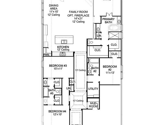 Welcoming porch extends to entry with home office at entry. Open family room with 12-foot ceiling and a large wall of windows. Dining area offers generous natural lighting with wall of windows. Island kitchen with built-in seating space and a corner walk-in pantry. Private primary suite features bedroom, double door entry to primary bathroom, dual vanities, garden tub, separate glass enclosed shower and two walk-in closets. Secondary bedrooms with walk-in closets, a utility room and a Hollywood bathroom completes this spacious design. Covered backyard patio. Mud room just off the three-car garage.