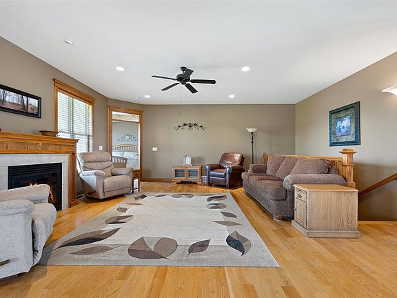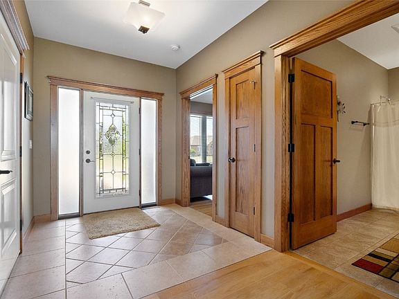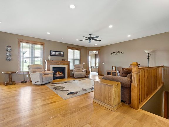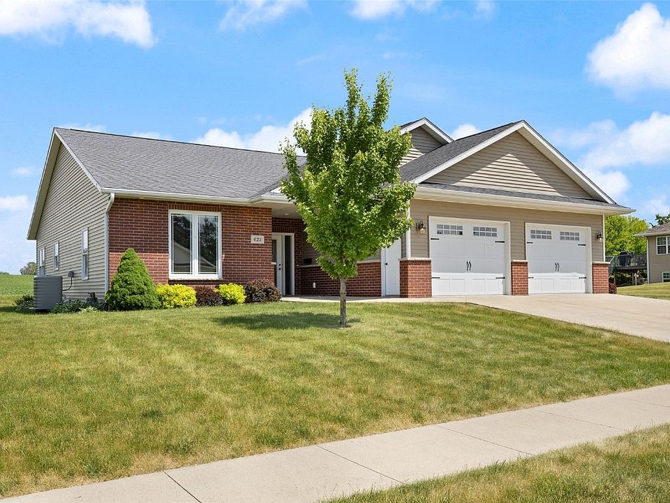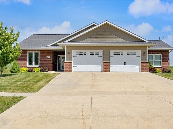 Stunning zero-entry, ranch home on the east side Anamosa. No feature was spared when this custom built, one-owner home was built in 2011. The warm, rich wood detail throughout is as inviting as it is beautiful. A large, open floor plan is perfect for family gatherings or entertaining. The transom window over the primary bedroom is just the beginning of the surprises – trey ceiling with dark wood trim, lots of windows for bright morning sun face the private open field. The attached bathroom includes a walk-in shower and a generous walk-in closet. A thoughtfully constructed laundry room is also situated within and can be closed off with a lovely transparent glass door. The oversized 2 stall garage is heated and has a floor drain for convenient melted snow cleanup. There’s also a bonus utility garage, which opens to the backyard – perfect for your lawnmower, yard and potting implements – or whatever it is you want to store separately from the main garage. A covered patio sits at the back of the home facing a large open field. It was finished with an aggregate stone floor, ceiling fan and power. It’s so private and quiet, you don’t realize you’re in town. Welcome Home!