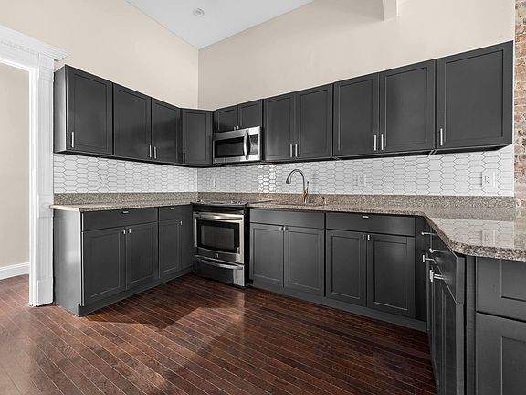 Exposed brickGood lightSoaring ceilingsElegant parlor floorDecorative mantleMassive kitchenLiving space