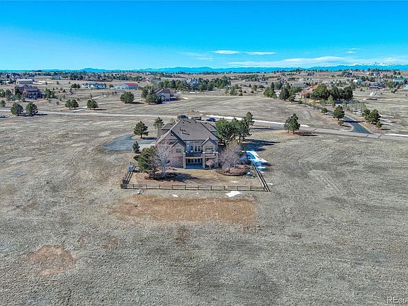 Welcome to your dream home in the coveted Sky Rim subdivision! This impeccable 5-acre property offers the perfect blend of serenity and convenience, being equidistant from Parker and the Southlands Mall. Step inside the two story foyer to this stunning home featuring gleaming hardwood floors, soaring ceilings and windows with eastern views for miles. Boasting five bedrooms and five bathrooms plus formal office, there is ample space for a large family or guests with its full finished walkout basement. Exclusive Main floor primary bedroom, vaulted ceilings, built in shelves, bench window with a double sided gas log fireplace & access to the rear deck. Enjoy the spa like six piece bathroom with heated bidet & walk-in closet to provide a touch of luxury. Next, enter through the French doors to your main floor office with high speed fiber internet. Three secondary bedrooms upstairs, two sharing a large bathroom, double vanity with a separate shower area, walk across the open railing looking below to the third bedroom which has a 3/4 ensuite bathroom and walk-in closet. The main level is anchored by a gourmet kitchen with JennAir stainless steel microwave, dishwasher, double ovens, downdraft gas cooktop on the nearly 8ft center island with an eat in kitchen nook open to a family room with a two story grand feature gas fireplace & large picture windows. The walkout basement offers a wide-open family room & recreation area with kitchenette, an additional large bedroom with walk-in closet, 2nd laundry. Plus another two additional flex spaces/non-conforming bedrooms, currently used as a workout gym and recording studio. Don’t miss the home theatre room including screen will make movie night a real treat! The oversized three-car garage has additional space for motorcycles/ATV's. Rear deck with serene easterly views. Entertain guests on the patio below surrounded by a maturely landscaped and fenced yard. Property is surrounded by Austrian, Ponderosa and Blue Spruce pine trees.