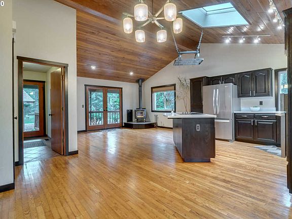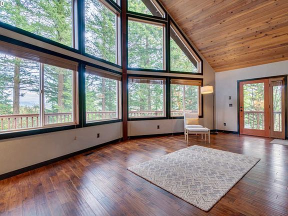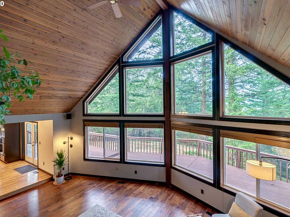 Mountain chalet nestled on 5 wooded acres. Immaculate! Gated entrance w/gorgeous pond & waterfall! Wall of windows to capture the view! Tongue & groove open-beamed ceilings! Hardwood floors & cozy woodstove! Updated kitchen features an island, new countertops & cabinets. Soaring ceilings w/skylights! Wrap around porch & huge deck for entertaining! Carport w/storage room. Approved plans for shop w/guest house above! Work remotely from this private retreat! Comcast & only 30 minutes to Portland!