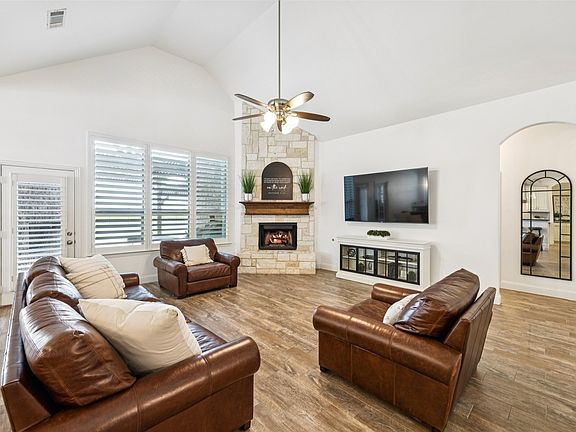 A gorgeous one-acre home feeding into the highly sought-after Amy Parks Elementary School in Rockwall ISD. This modern, recently painted one-story home offers a move-in-ready experience at a competitive price. Inside, you’ll find a study, dining space, and spacious living room that is open to the kitchen with a floor-to-ceiling stone wood-burning fireplace (with gas starter). The kitchen includes a recently replaced dishwasher, bar, granite countertops, gas stovetop, and a generously sized pantry. Just off the kitchen is a game room, perfect for young children, and a laundry room with ample counter space. The spacious primary bedroom features a large en-suite bathroom with plenty of space for two to get ready, along with a roomy walk-in closet. Three additional bedrooms are complemented by two well-styled bathrooms. The three-car garage provides room for larger vehicles such as a full-sized truck. The outdoor living space is equally impressive, with a covered patio, wood-burning fireplace, fire pit, and three pergolas that provide a perfect balance of shade and sun. High-quality metal fencing lines the backyard. The current owners have made multiple upgrades over the past three years, including replacing the carpet in the game room and primary bedroom with wood-look tile, installing new carpet in the secondary bedrooms, adding a new roof with high-impact shingles last year, and widening the driveway for additional parking. The owners had also planned to add a brick workshop, with plans and drawings available to the buyer. The workshop next door is the same design.