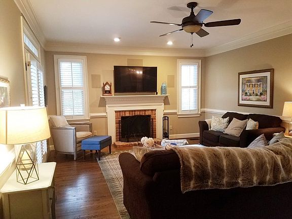 This home in quiet Stevens Pointe is easy to love! Custom built by Jimmy Garren, the home features five bedrooms and three bathrooms, including a bedroom and full bath downstairs. The downstairs offers hardwood flooring throughout the common living areas, including a formal living room and dining room with custom millwork, a granite kitchen, dedicated laundry room, and spacious family room with wood burning fireplace. Every window in the home has custom-made wooden louvered blinds! Upstairs, find the owner's suite with separate tub and shower, walk-in closet with built-in dresser, three additional bedrooms and a hall bath. A large deck designed for entertaining overlooks the beautifully landscaped and privacy fenced backyard. Zone for sought-after Stevens Creek Elementary, Stallings Island Middle and Lakeside High School.