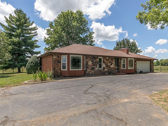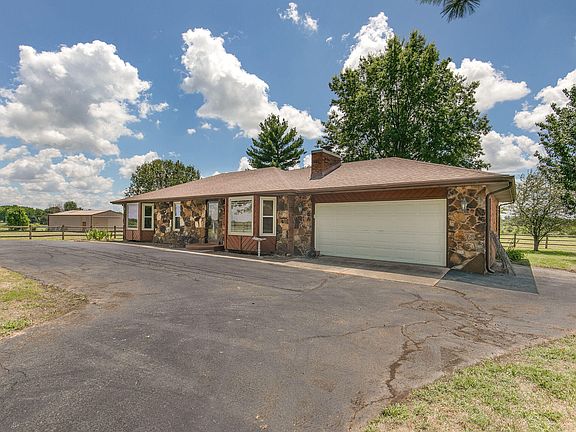 Excellent opportunity to own a Springfield home on 6.49 acres in Strafford Schools! Featuring a private circle drive, this 2 bed, 2 bath, 2 car garage home offers country living while being only minutes off Hwy 65. Walk into an open floor plan with a front bay window and hardwood floors. Living room features a wood burning stone fireplace and flows nicely into the dining room and kitchen. Kitchen has stainless appliances, beautiful subway tile backsplash, granite counters, and wooden counters on the bar with pendant lighting. Off the kitchen is a laundry room with detailed tiled flooring. From the dining room, exit through a set of French doors into an oversized sunroom. The sunroom features vaulted ceilings, windows all around, and access to the wooden deck. Primary bedroom suite features a wall to wall bathroom vanity, skylight, walk-in shower, and walk-in closet. There is one more bedroom, and a full bathroom. Outside is a wonderful wooden deck overlooking the acreage. The yard has mature trees and a wooden fence. Home is all electric. Located near Hickory Hills Country Club and Hickory Hills School.