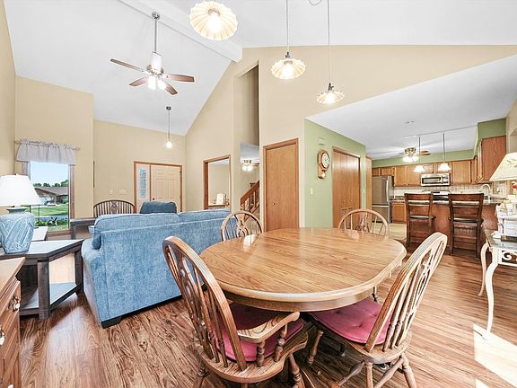 This well-kept townhome in the desirable Hilltop subdivision is truly move-in ready, offering space, functionality, and a long list of recent upgrades. Step inside to an open floor plan featuring vaulted ceilings in the living and dining rooms, and a spacious eat-in kitchen with a breakfast bar and tiled backsplash. The 4-seasons room is the perfect place to relax and enjoy the surrounding nature. The main floor also includes a den that could easily be converted into a first-floor bedroom, with direct access to a full bathroom. Upstairs, you'll find a generously sized primary suite with a walk-in closet and private bath, along with a second bedroom-also with a walk-in closet-and an additional full bath in the hallway. The laundry is conveniently located on the main floor, and the attached 2-car garage keeps your vehicle protected year-round. Major updates include a new roof (2020), freshly stained exterior (2024), new furnace and AC (2023), and updated washer, dryer, refrigerator, and stove (2021). Fourteen windows have been refurbished, and updated lighting and ceiling fans have been added throughout. With lawn care, snow removal, and exterior building maintenance handled by the association, this is low-maintenance living at its best.