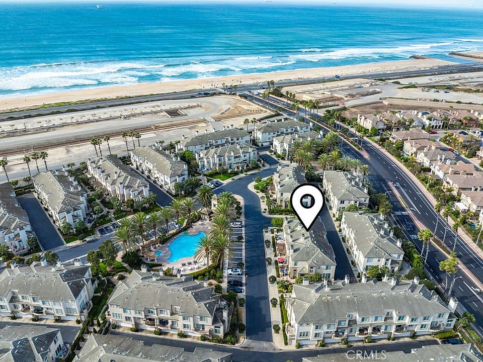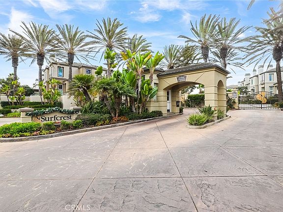 Arguably one of the best locations within the prestigious gated community of Surfcrest. This perfectly positioned row of 4 units overlooking the resort stye pool and spa hasn’t been available in over 20+ years and gives incredible views. This property receives tons of natural light all day long due to its location and non obstructed frontage. Ample guest parking close by so guests do not have to park far. Very well taken care of by original owners. As you walk in you’ll find the formal living room with fireplace and sliding doors leading out to the oversized patio, great for entertaining! Boasting an open floor plan with a balcony off of the kitchen / living area. 3 bedrooms, 2.5 baths, the primary suite offers amazing views of the pool and also has peek a boo ocean views, large walk-in closet, cozy fireplace, soaking tub, separate shower, and dual sinks. High ceilings throughout, tankless water heater, soft water system, oversized finished garage with storage and a large convenient interior laundry room with utility sink. Close to Main Street, The Huntington Club, Central Park, Wetlands,Shopping, Restaurants, Dog Beach, Bike Paths, and Award Winning Schools!