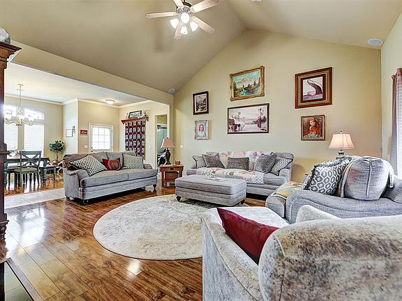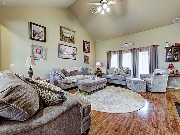 Come see this stunning 4 bed, 3 bath home!!! Huge yard on a quarter acre lot with beautiful stained fencing, lots of trees, extra large driveway in cul-de-sac. Full sprinkler system in front and back. The living room has a vaulted ceiling, beautiful gas fireplace, surround sound speakers and wood laminate floors. You'll love the formal dining for holidays. The kitchen is equipped with a gas cooktop, granite counter tops and a cozy dining space. The master bed and bath is spacious with double vanities, walk in shower, walk in closet and jetted tub. Two of the bedrooms are connected to a Jack and Jill with wood laminate floors, separate sinks and separate access to shower and toilet. The garage is oversized with a storm shelter. Relax in the backyard oasis with tons of trees, green grass and nice fencing. You'll love what this home has to offer. Come see it today!