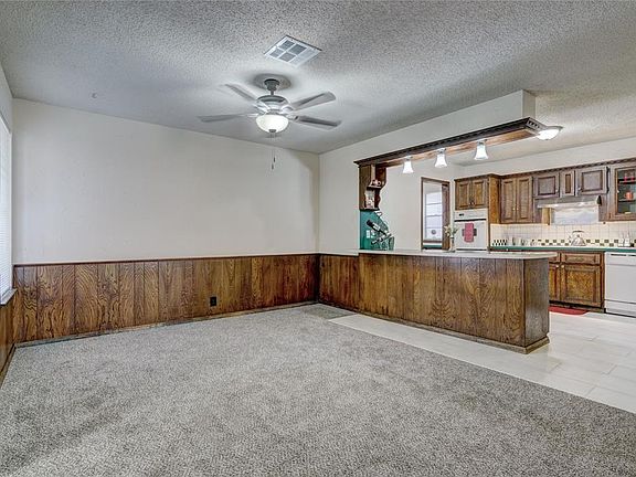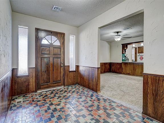 This darling 3 bedroom, 2 bath home is conveniently located in the heart of Warr Acres. You'll love the large L-shaped driveway with welcoming front door, followed by immaculately kept vintage mid-century tile entryway! Not only did it get a BRAND NEW ROOF in October 2023, this home has been thoughtfully updated with brand new tile in the kitchen, laundry room and guest bathroom, has fresh neutral interior paint and new carpet throughout. Gorgeous stained wooden built-ins and cozy mantle above the gas starter, wood burning fireplace would be just lovely around the holidays! Large family room with vaulted beamed ceiling, open dining room / kitchen concept, laundry room with overhead storage and additional desk space for office/students or for folding clothes are just a few things that will grab your attention. Primary bedroom also has a vaulted beamed ceiling, large walk-in closet and a beautiful bathroom featuring a "prism skylight" so it's nice and bright, without even having the light on! This home backs to the long driveway leading to Capps Middle School so you'll not have neighbors directly behind the fence!