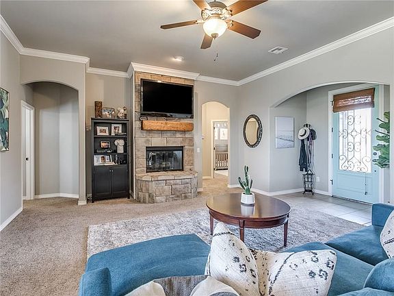 This home's beauty doesn't end at the gorgeous curb appeal and covered porch. Step inside and take in the splendor of the main living area and you know you've arrived home! The spacious living room features a stone fireplace with wood mantle, 10 foot ceilings, and picture windows overlooking the backyard. The well-designed kitchen is open to the great room and includes a stone accent center island with counter seating. You will fall in love with the sleek kitchen with rich maple cabinetry with under cabinet lighting, granite counters, and stainless steel appliances. The master retreat is nestled into the corner of the home, featuring a tray ceiling, and the bathroom includes dual vanity, jetted tub to relax in with a barrel ceiling, tiled extra tall shower and a master closet. Crown molding in living room and master. Stamped stained concrete patio. 6-8 person storm shelter in the garage. Strat your new lifestyle at 6213 SE 79th Street... Welcome Home!