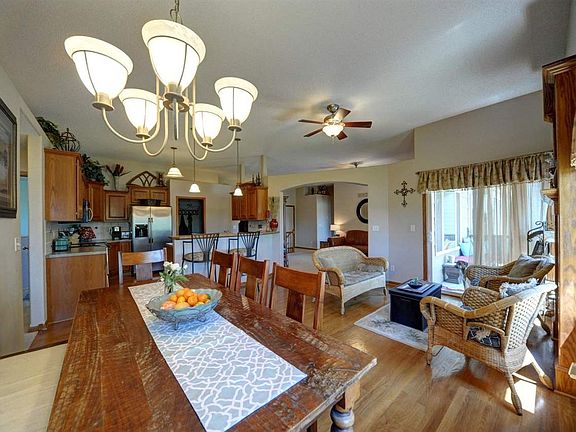 This is the one you've been waiting for! Beautiful 4 Bedroom, 3 Bath Ranch style home with stacked stone and brick front and neutral decor. Located in desirable Ridge Port neighborhood, in the Maize school district. Close to K-96 highway for commuting, west side dining, shopping, Sedgwick County Park and Zoo, entertainment and golf courses. Many upgrades throughout show a owner lovingly maintained home. Open floor plan with split bedrooms and two fireplaces. The spacious living room flows nicely into the hearth/dining room and kitchen. Beautiful hardwood floors, large eating bar, staggered oak cabinets, tumbled marble back splash and stainless steel appliances. Main floor laundry is right off kitchen. New Refrigerator in 2014. Lovely Master Suite has vaulted ceilings, walk-in closet, and great views out the bay window to the lake. Beautiful Master Bath with double sinks, separate shower and whirlpool tub as well as a private water closet for the toilet. You'll entertain with pride upstairs where there is abundant space for family and friends to gather. Huge walkout/view out basement faces the lake to the South for spectacular views and natural sunlight. Family/Rec Room is professionally wired for upgrades to quality surround sound speakers and has a gorgeous custom stacked-stone gas fireplace. Custom designed wet bar is perfect for entertaining and has many upgrades including granite work. The recreation area has a pool table that can be negotiated separately. This particular space was originally designed for a 5th bedroom and could easily be added. The 4th bedroom is nice sized and is next to the third full bath. The bathroom has more beautiful tile work with a separate waterless porcelain urinal. There's a custom built-in desk and private, "hidden room". Outside there is a covered deck above, just off the hearth/dining room. Below is a great walk-out pit area. A large patio off the deck, shaded by a grand tree, allows for casual, relaxing and entertaining with a lake back drop. Three car over sized garage, overhead storage in the garage with pull-down ladder, this also has an extra wide driveway. Awesome lawn and landscaping with sprinkler system on a private irrigation well, surrounded by wrought iron fence. There is a community playground and basketball court nearby. Specials are nearly paid off. This home is stunning and shows like a model. You could be living the dream in this beautiful home! Call today for your showing, this lakefront beauty will sell fast!