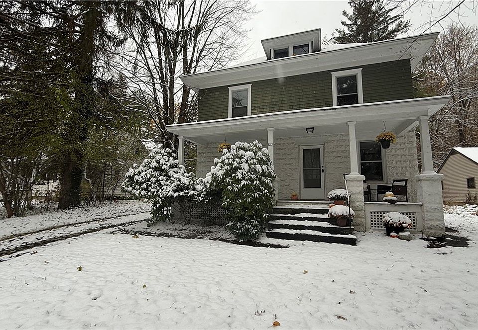 Classic Four Bedroom/1.5 Bath, two-story Historic Home with XXL backyard, 2 Outbuildings, Fenced Gardens on the outside & gleaming Hardwoods, Original Molding, Pocket Doors, Big Windows, & Walk-Up Attic Inside. Formal Foyer welcomes you into the Home, through to Dining Room, Living Room, and Eat-In Kitchen and a Powder Room. All Bedrooms Upstairs feature hardwoods, and fabulous, spacious closets (unusual for age of home). The walk-up attic is easy access & has storage galore. Access to the basement inside & outside, workshop area, extra room and even more storage. 2 Concrete Floored Outbuildings, a two car garage/workshop and one car/garden shed (or however you'd like to use them) located off long driveway with plenty of parking & turn around. Don't miss backyard - Property is 53' x 500' - Pets will LOVE! Picture yourself with morning coffee on the Eastern Open Porch and Night Cap by the Fire pit in the Private Backyard. Winter lake views from front porch and east facing bedrooms. Flagstone patio for Al fresco dining. Birdwatchers paradise with yearly nesting great horned owls and many migratory birds passing through wooded backyard. Natural fence line of Perennial Forsythia and Lilac & mature shade trees. 10 minute walk to Owasco Lake & Dog Park!