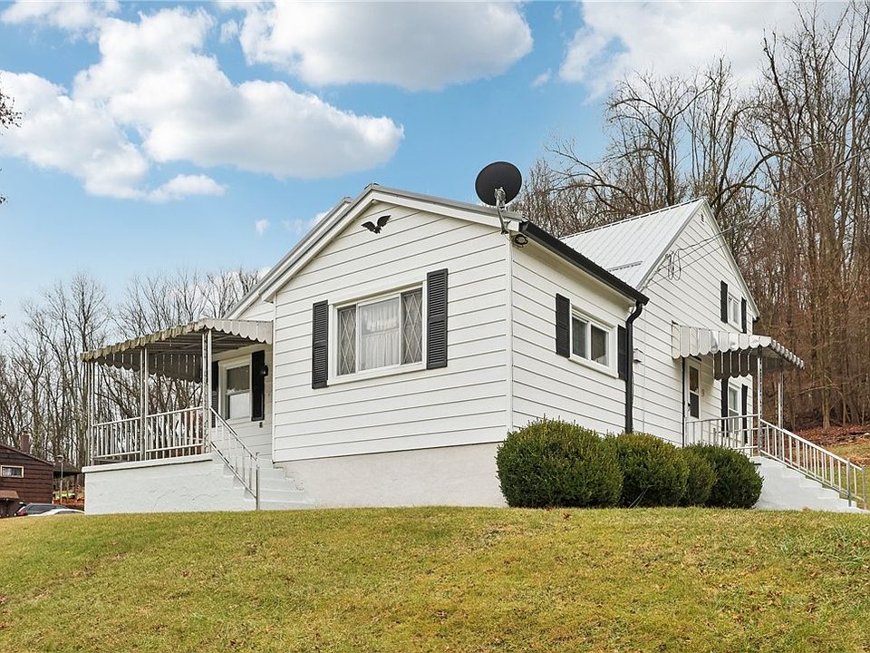 Nestled on a sprawling 2-Acre lot, this story and a half home is a perfect blend of charm and functionality, showcasing its durable steel construction siding and sleek low maintenance metal roof. The kitchen is thoughtfully designed to include appliances and ample counter space and opens to an area to create as you choose. Many possibilities. The living room is spacious with neutral carpeting, entry closet and leads to the covered front porch. Two bedrooms and a full bathroom complete this level. The upper level boasts a large bedroom with a double closet. The additional room could be a bedroom, den, nursery. Currently styled as a bedroom. The large unfinished basement offers a blank canvas for customization, The additional storage room within the basement provides plenty of room to organize seasonal items, tools and more. Located within the Kiski School District. New well installed.