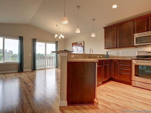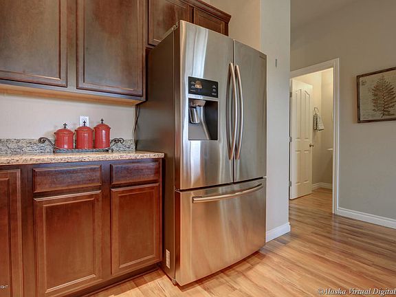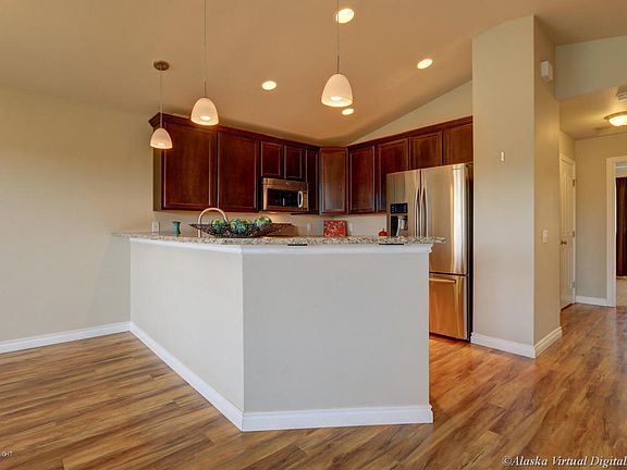 Contemporary layout with master suite on main level, greatroom with vaulted ceilings, open kitchen with long breakfast bar, stainless steel appliances incl fridge, and granite countertops. Easy maintenance laminate flooring, satin nickel fixtures & extra lighting. Located close to JBER, this townhouse looks brand new, has great sun exposure, and a private fenced yard with access in to lower level.