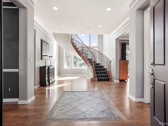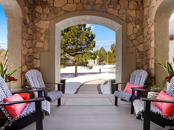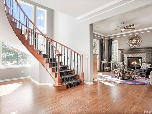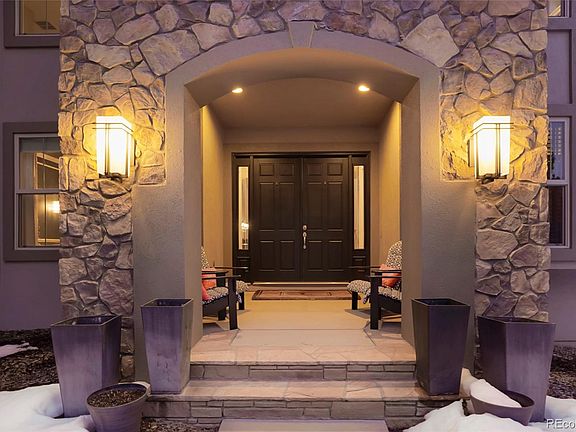 Beauty and sophistication in this coveted gated community, The Village at Castle Pines! Easy living among the pines, backing to open space, on a private street, with beautiful professional landscaping. Be the first to see this highly sought after 2 story plan, with main floor bedroom, 2 separate staircases, floor to ceiling windows, beautiful wood floors, and soaring ceilings throughout! The purposeful kitchen, with stainless appliances, has an oversized eat-in island, dining nook, granite counters. The kitchen connects to the adjacent sizable butlers pantry, walk-in pantry, and beverage station. The generously sized family room, with a gas fireplace, has an open concept to the kitchen and back deck, easy access for entertaining and BBQ, while enjoying the quiet open space. The stunning main floor dining room has custom paint and lighting, and is adjacent from the entry. The spacious office, is quietly off the entry. The living room, with a gorgeous custom fireplace mantle and surround, has access to a private deck, via french doors. A rare find, to have a lovely main floor bedroom and bathroom ensuite. The main floor laundry room includes plenty of storage with built-in cabinets, utility sink, and closet. The 1/2 bath completes the first floor. The second floor boasts wood floors in halls, loft and oversized Primary Suite with seating area. The Primary Bath ensuite includes tile floor, double sink vanity, granite, shower, bathtub, and large walk-in closet. 2 more bedrooms, 2 more bathrooms and loft complete the upstairs. The finished walk-out basement awaits with wood floors, wet bar, theater room, exercise room, 2 additional beds and 1 full bath. Situated on 1/2 acre and backing to open space, outdoor living includes gas fire pit, hot tub, patio space and 2 trex decks. The HOA includes 3 pools, fitness center, pickle ball, tennis, 13 miles of trails, gated and staffed with 24/7 emergency services. Close to Gate 5, Summit Pool, and the Country Club at Castle Pines