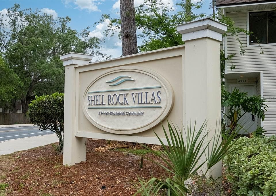 Check out this remodel!!! This 2 bedroom, 1.5 bath townhouse is located in Shellrock Villas. This end unit townhouse is conveniently located to the Oaks Mall, I-75, North Florida Hospital, Shands, UF, entertainment and dining. The first floor features a brand new updated kitchen with new cabinets and appliances, living room/dining room combo, half bath, wood burning fireplace, and washer/dryer hookups in the utility room. Back porch off the living room area. Upstairs bath has been fully remodeled with a walk in shower. Both bedrooms and full bath are located on the second floor. Unit is move in ready. The exterior storage offers plenty of room for your overflow of storage. Building exterior, garbage service and lawn maintenance are maintained by the HOA. Monthly HOA fees cover exterior insurance (including roof). Two reserved parking spots give you quick and easy access to the home. Please note: home has security cameras on.