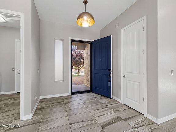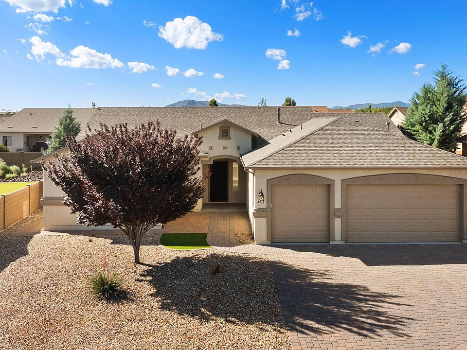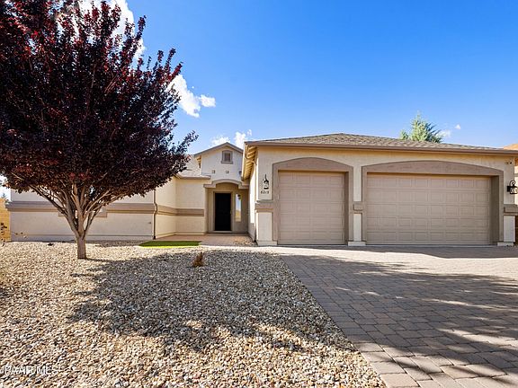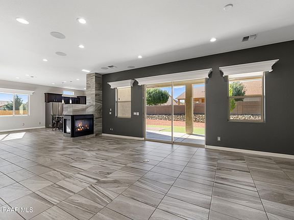 ONE-OF-A-KIND, MODERN STUNNER - Spotless and set on a coveted cul-de-sac, this highly upgraded Granville home is a stylish showplace you'll be proud to call home. The split floorplan offers 4 bedrooms/2 baths and makes excellent use of all 2,334 square feet. Greet your guests with an upscale paver driveway and a charming paver patio at the entry -a bonus outdoor space to relax and enjoy a breeze. With a striking accent wall and tile, dramatic cornice boxes, and unique 3-sided fireplace, the central living space is a ''wow'' and the perfect place for entertaining or memorable family time. The bright kitchen stars an expanse of staggered espresso cabinetry with mood-enhancing underlighting, complimented by an on-trend tiled backsplash, coordinating granite countertops, and eye-catching pendant lights. The corner pantry, Samsung FlexZone refrigerator, soft-close cabinets, gas range, and undermount sink set in a large island are practical and handy for the cook in your family. Stretch out and unwind in an enormous primary bedroom, enhanced by a classic bay window. The sharable ensuite with TruStone detail offers dual sinks in separate raised vanities, an enclosed shower with dual showerheads, a spacious walk-in closet, and a Solatube skylight to bring in beautiful, natural light. Lighten your workload in a laundry room with enhanced cabinetry, counterspace, and a Samsung washer & dryer set. A water softener adds comfort while protecting plumbing and appliances. Spend your free time in an easy-care backyard paradise: throw a party and watch the big game on the covered patio's TV while the kids romp on the durable synthetic lawn. Store tools and toys effortlessly in the sturdy utility shed. Extra room for parking or hobbies in the 25-foot-deep 3-car garage. Quality construction: 2x6 exterior framing, post tension foundation, 10-foot ceilings, and 8-foot doors. Granville's extensive community amenities are included in a very reasonable HOA fee. A location that's convenient to all the best of Prescott Valley - plus easy access to Highway 89A - add the perfect finishing touch.