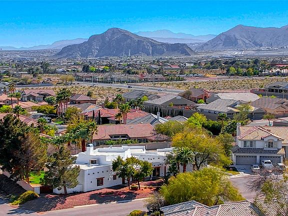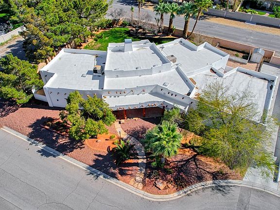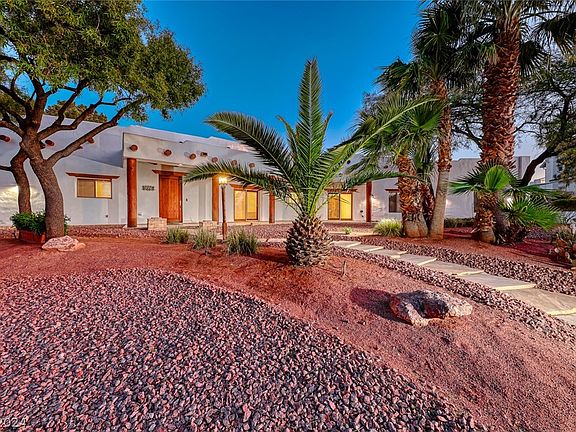 Nestled in the mesmerizing Las Vegas desert landscape, this exquisite custom adobe-style home on a sprawling half acre lot embodies the essence of Southwestern charm. Boasting distinctive architectural features, this residence offers a unique blend of authenticity & luxury. The home's inviting interior features 8-foot solid wood doors throughout, accentuating its spacious 14-foot ceilings adorned with natural log beams & cozy fireplace in the great room. Retreat to the sumptuous master suite, complete with a spa-like en-suite bath & private patio. A secondary bedroom offers its own bath, walk-in closet & separate entrance leading to a private patio, while two additional bedrooms share a jack-n-jill bath & provide sliding doors to the lush, mature backyard. The outdoor living space includes a built-in BBQ, cabana bath, surround sound, shed, garden area, fruit trees & RV parking. With its unparalleled craftsmanship, shared well & no HOA, this home stands out as a must-see hidden gem!